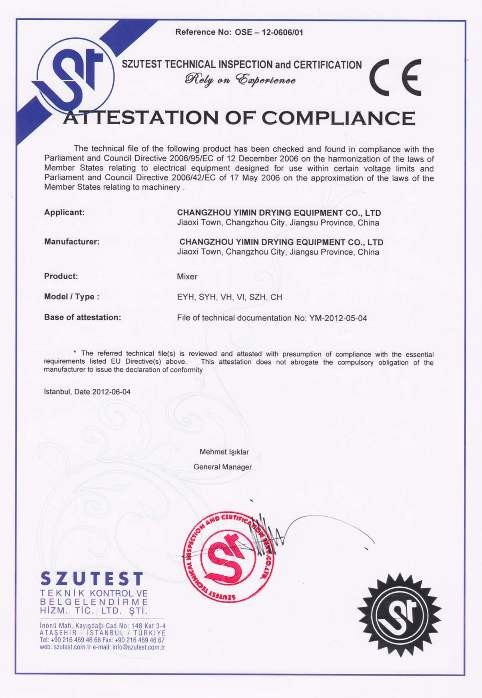 我(wǒ)公司噴霧幹燥機(LPG離心噴霧,ZLPG中藥浸膏噴霧,YPG壓力噴霧),WDG生(shēng)產線,混合機(CH槽型,SYH三(sān)維,EYH二維(wéi),V型,VI強製型)已通過歐盟CE認證。多台設備出口至歐(ōu)盟國家包括羅馬尼(ní)亞(yà),西班牙,土耳其,德(dé)國等。獲(huò)得(dé)客戶的一致好評。