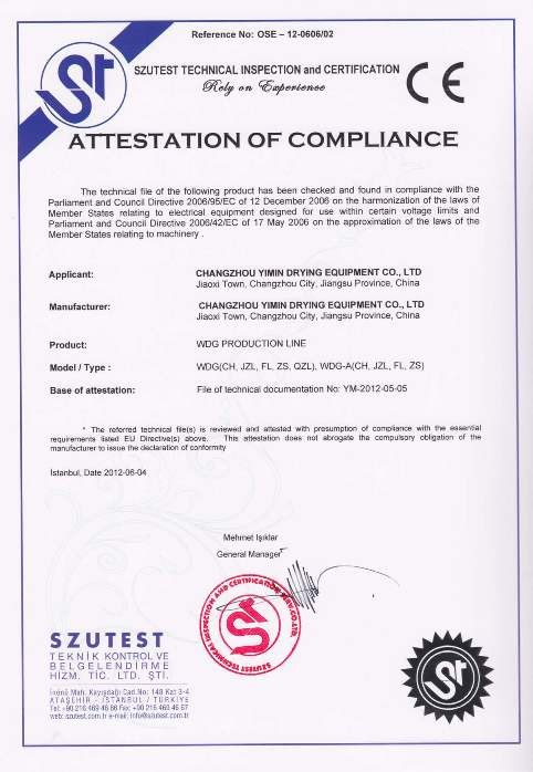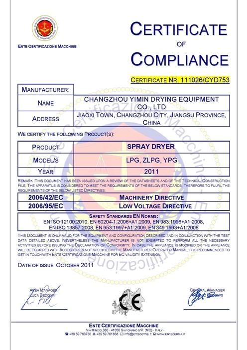我公司噴霧幹燥機(LPG離(lí)心噴霧,ZLPG中藥浸膏噴霧,YPG壓力(lì)噴霧),WDG生(shēng)產線,混(hún)合機(CH槽型,SYH三(sān)維,EYH二維,V型,VI強製(zhì)型)已通過歐盟(méng)CE認證。多台設備出口至歐(ōu)盟國家包括羅(luó)馬尼亞,西班牙,土耳其(qí),德國等。獲得客戶的一致好評。
