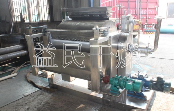 該真空耙式幹燥機工作容積600L,采用大麵積(jī)夾層加(jiā)熱方式,濕物料經傳導蒸發,帶有刮板攪拌器不斷清除熱麵上的物料,並在容器內推移形成循環流,水份蒸發後由真空泵抽出。滾筒刮板幹燥機是一種內加熱傳導型轉動連續幹燥設備,具(jù)有熱效率高、幹燥時間短(duǎn)、幹(gàn)燥(zào)速(sù)率大等特點。,適用於化工(gōng)、染料、製藥等(děng)行業液(yè)體或交粘稠物料的幹燥。