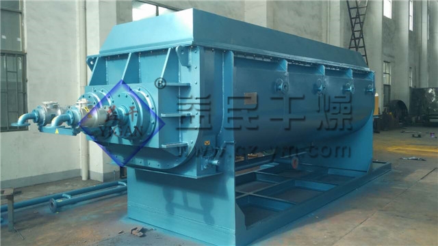 槳葉幹燥機空心軸上密(mì)集排列著楔型中空槳葉,熱(rè)介質經空心軸(zhóu)流經槳(jiǎng)葉。單位有效容積內傳熱麵積很大,熱介質(zhì)溫度(dù)從-40℃到320℃,可以(yǐ)是水蒸汽,也可以是液體型:如(rú)熱水、導熱油等。間接傳導加熱,沒有攜(xié)帶空氣帶走熱量,熱量均用來加熱物料。熱量(liàng)損失(shī)僅為通過器體保溫層向環境的散熱。楔型槳葉傳(chuán)熱麵具有自清潔功能。物料顆粒與楔型麵的相對(duì)運動產生洗刷作用,能夠洗刷(shuā)掉楔型麵上附著物料,使運轉中一直保持著清潔的(de)傳熱麵。槳葉幹燥機的殼體為W型,殼(ké)體內一般安排二到(dào)四根空心攪拌軸。殼體有密封端蓋與(yǔ)上蓋,防止物料粉塵外泄及收集物料溶劑蒸(zhēng)汽。出料口處設置一(yī)擋扳,保證料位高度,使傳熱麵被物料覆蓋而充分(fèn)發揮作用。熱介質通過旋轉接頭(tóu),流經殼體夾套及空心攪拌軸,空心攪拌(bàn)軸依據熱介質(zhì)的類型而具有不(bú)同的內部結構,以保證^佳的傳熱效果。